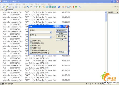 第五步:按Ctrl+A全選命令行語句,再按Ctrl+V進行復制,接著打開EmEditor將內容粘貼進去,按下Ctrl+H打開“替換”對話框,在“查找”欄中輸入:“(中文輸入法狀態下的左雙引號),在“替換為”欄中輸入:” (英文輸入法狀態下的雙引號),點擊“替換全部”按鈕進行替換(圖5)。