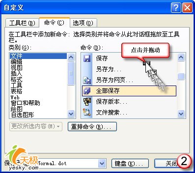 小提示:我們也可以直接把“全部保存”命令直接添加到“文件”菜單上,方法是:在“自定義”對(duì)話框上,把“全部保存”拖動(dòng)到“文件”菜單中(如圖2)。這樣,當(dāng)共用模板(Normal.dot)發(fā)生改變時(shí),直接點(diǎn)擊該命令即可。