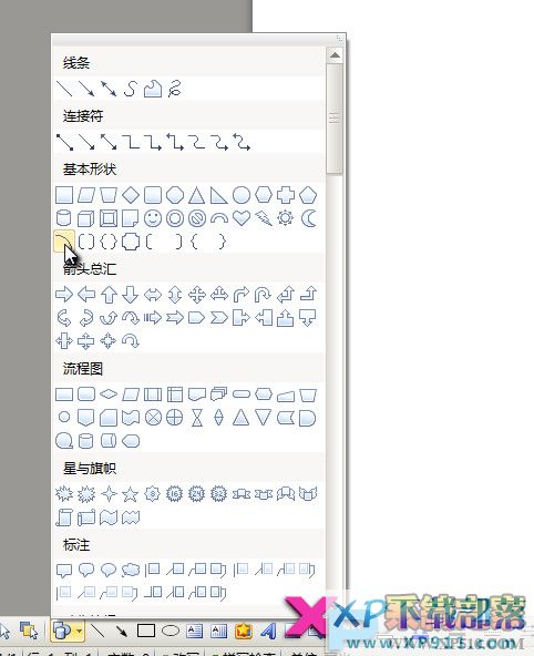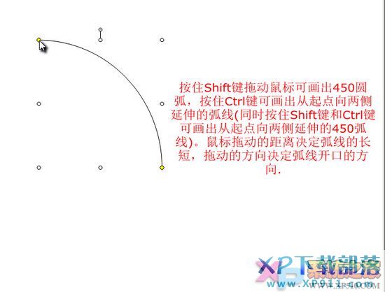 8. 畫弧。繪圖工具欄——自選圖形——基本形狀——選用“畫弧”工具,按住Shift鍵拖動鼠標可畫出450圓弧,按住Ctrl鍵可畫出從起點向兩側延伸的弧線(同時按住Shift鍵和Ctrl鍵可畫出從起點向兩側延伸的450弧線)。鼠標拖動的距離決定弧線的長短,拖動的方向決定弧線開口的方向.