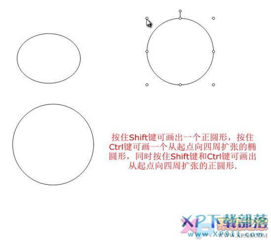 10. 畫正圓和橢圓。單擊“橢圓工具”,按住Shift鍵可畫出一個正圓形,按住Ctrl鍵可畫一個從起點向四周擴張的橢圓形,同時按住Shift鍵和Ctrl鍵可畫出從起點向四周擴張的正圓形.