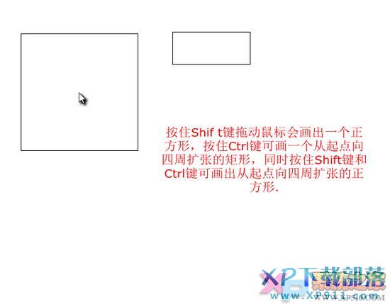 9. 畫正方形和矩形。單擊“矩形工具”,按住Shif t鍵拖動鼠標會畫出一個正方形,按住Ctrl鍵可畫一個從起點向四周擴張的矩形,同時按住Shift鍵和Ctrl鍵可畫出從起點向四周擴張的正方形.