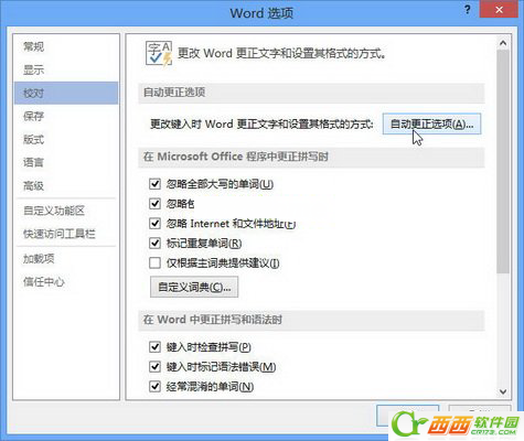 第2步,在打開的“Word選項”對話框中切換到“校對”選項卡,然后在“自動更正選項”區域單擊“自動更正選項”按鈕,如圖2所示。