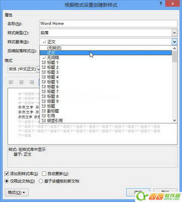 第4步,單擊“樣式基準”下拉三角按鈕,在“樣式基準”下拉列表中選擇Word2013中的某一種內置樣式作為新建樣式的基準樣式。本教程選擇“正文”作為基準樣式,如圖4所示。
