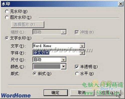在“字體”和“尺寸”編輯框中分別選擇水印文字的字體和尺寸,并設置水印文字的顏色(建議設置為灰色)。然后選中 “半透明”復選框,并根據需要在“版式”區域選中“斜式”或“水平”單選按鈕。設置完畢單擊“應用”按鈕查看效果,確定效果合適后單擊“關閉”按鈕即可,如圖2010060902所示。
