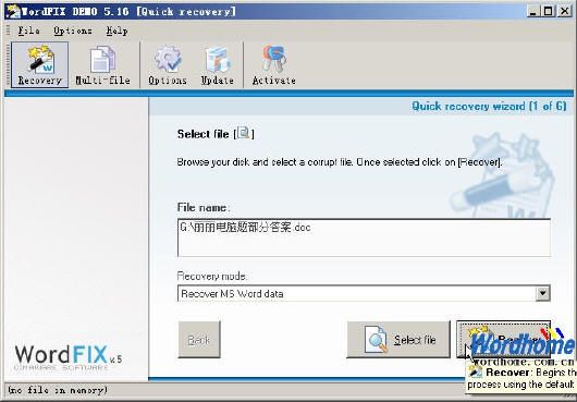 第4步,返回“Select file(選擇)”頁面,在“Recovery mode(恢復模式)”下拉列表中選擇恢復模式。WordFix提供了三種模式,即“Recover MS Word data(恢復Word文檔中全部數據)”、“Recover text data(僅恢復文本內容)”和“Extract images from the file(從文檔中提取圖像)。選中“Recover MS Word data(恢復Word文檔中全部數據)”模式,并單擊“Recover(恢復)”按鈕,如圖所示。
