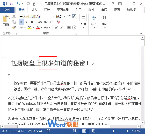 我們在Word2013中某處輸入文字,會將之前的文字覆蓋掉,如下圖所示。