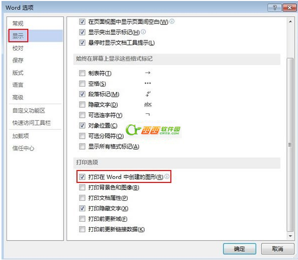 ?、芮袚Q到顯示標簽,拉動滾動條,在顯示里面勾選打印在Word中創建的圖形。