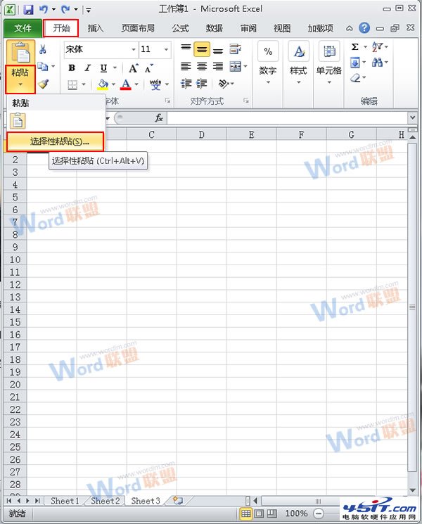 2、接下來啟動Excel軟件,單擊“打開”選項卡,在“剪貼板”區(qū)域單擊“粘貼”選項組的下拉按鈕,在彈出的下拉菜單中選擇“選擇性粘貼”命令;