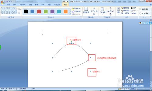 通過調節兩端的控制點,可以改變線段的長度和角度,系統自動切換到形狀格式選項卡,可以設置形狀的顏色,線條的粗細等。我們可以根據下圖的提示來進行調整曲線。