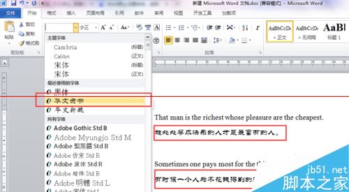 5、這時我們來演示一下,全選所有中英文文本,點擊字體,在中文字體中隨意切換,由于Word2010版本有一個預覽模式,可以直接在頁面上看到中文字體的不斷改變,而英文字體沒有任何變化,不受到影響