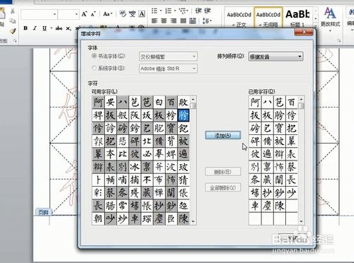 4、在”可用字符“列表框中選擇需要加入字帖的漢字,單擊”添加"按鈕將其加入到字帖中,再單擊“關閉”按鈕關閉該對話框。