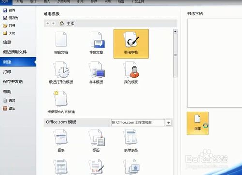 2、在中間的“可用模板區域單擊“書法字帖”按鈕,再單擊”創建“按鈕。