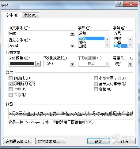 3、在“字體”選項卡中鉤中“雙刪除線”復選框。然后點擊“確定”。