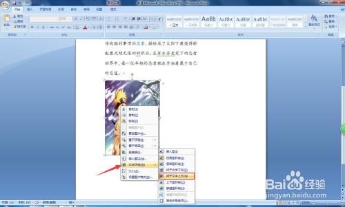 4、所以我們就要對圖片進行一些設置。右鍵單擊已經插入的圖片,選擇文字環繞——浮于文字上方。