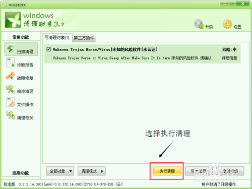4、掃描完成后我們會(huì)發(fā)現(xiàn)有幾個(gè)可以清理的對(duì)象,其中一般有2個(gè)風(fēng)險(xiǎn)高的可清理對(duì)象,選中它們并點(diǎn)擊執(zhí)行清理,然后等待清理完成。(我的電腦因?yàn)橐呀?jīng)清理過了,所以圖中只有一個(gè)風(fēng)險(xiǎn)中的未認(rèn)證對(duì)象)