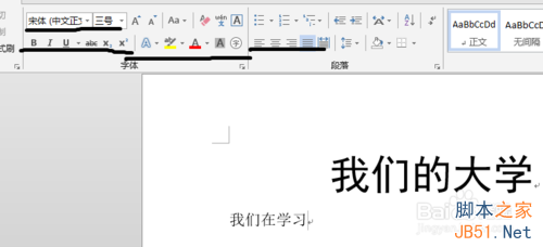 這時,我們就進入正文了,輸入標題,“我們的大學”,點擊鼠標左鍵,覆蓋所有文字,然后,點擊圖2里所示的兩個下拉菜單,就可以選擇你想要的字體,還有字體大小。