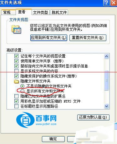 2、點擊“查看”頁簽,找到“隱藏文件和文件夾”選項,將其屬性設置為“顯示所有文件和文件夾”然后確定。
