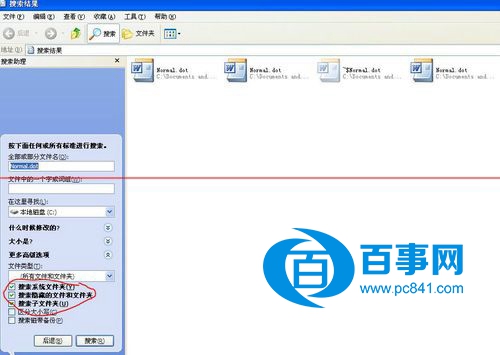 4、如果實在找不到,“開始”--->“搜索”,然后在左側選擇“所有文件和文件夾”,出現下圖,在“全部或部分文件名”內輸入“Normal.dot”,記得把下方的三個選擇框都勾上,不然搜索不出來