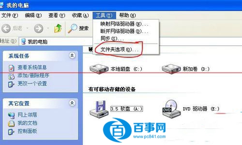 1、雙擊“我的電腦”--->工具---->文件夾選項,其實任意一個文件夾下的菜單都有這個選項