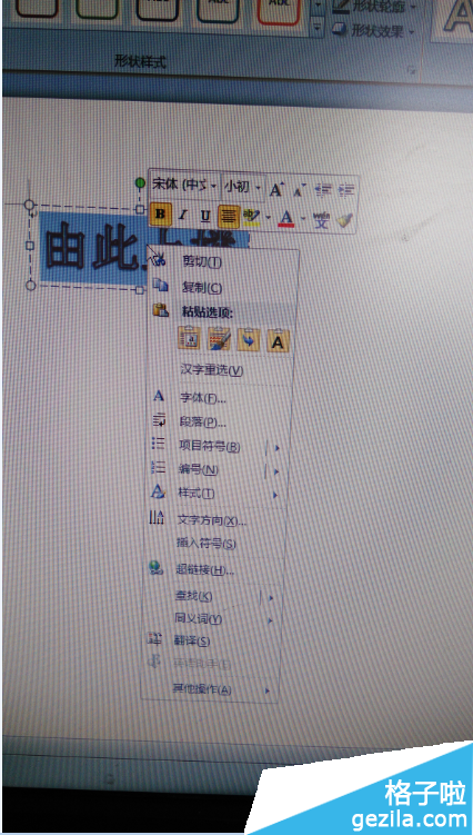 選中目標字體然后點擊右鍵,現在2010版的藝術字體設置都用右鍵,右鍵快捷鍵放大字號,選擇適合的字體等等,這些和077版雷同,此不贅述。
