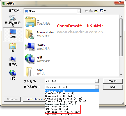 1、保存ChemDraw編輯好的結構圖,要注意的是保存類型要選擇圖片格式,比如:gif、bmp以及jpeg格式,如下圖所示: