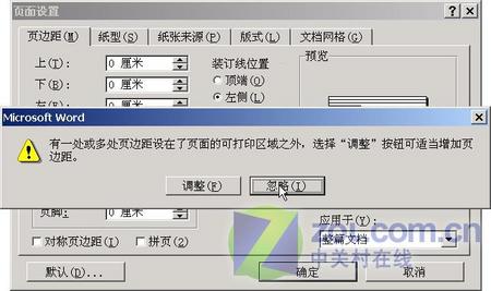 對(duì)供電腦觀看的賀卡來(lái)說(shuō),應(yīng)再次打開(kāi)“頁(yè)面設(shè)置”窗口。將“頁(yè)邊距”選項(xiàng)卡中的“上”、“下”、“左”、“右”和“距邊界”下的“頁(yè)眉”、“頁(yè)腳”的數(shù)值都修改為0厘米。單擊“確定”,在隨后出現(xiàn)的警告對(duì)話框中單擊“忽略”按鈕即可(如圖2)。對(duì)供打印的賀卡來(lái)說(shuō),可根據(jù)需要設(shè)置大小合適的版芯。
