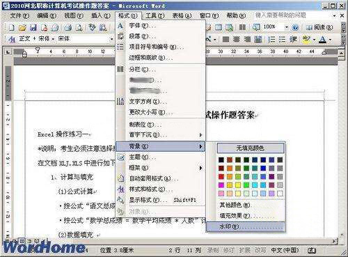 第1步,打開Word2003文檔窗口,在菜單欄依次單擊“格式”→“背景”→“水印”菜單命令,如圖2010060901所示。