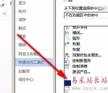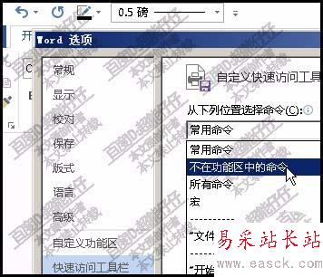 3、然后,再在常用命令這里點擊下拉按鈕,彈出列表中,選擇:不在功能區的命令
