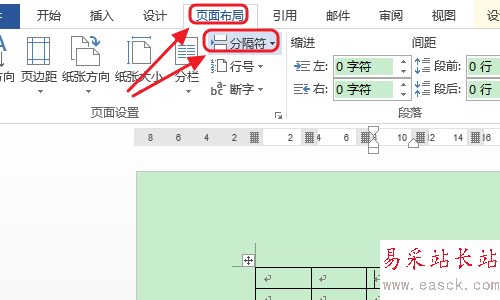 ①這次我們將光標(biāo)定位在表格第一行的任意位置,然后點(diǎn)擊工具欄“頁(yè)面布局”-“分隔符”,如下圖;