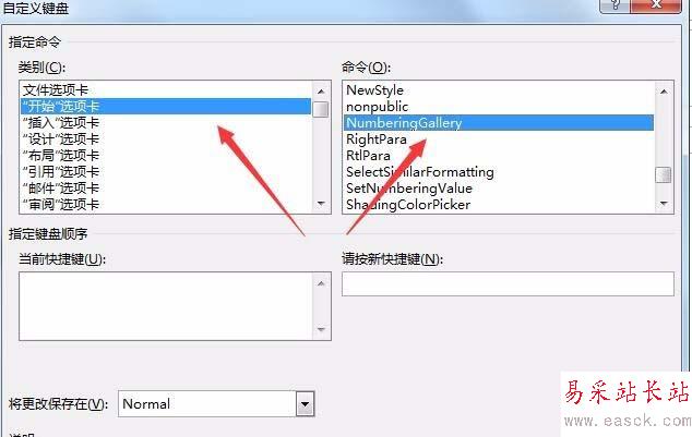 5、在自定義鍵盤窗口中,點擊左側的“開始選項卡”,在右側窗口中找到NumberingGallery一項