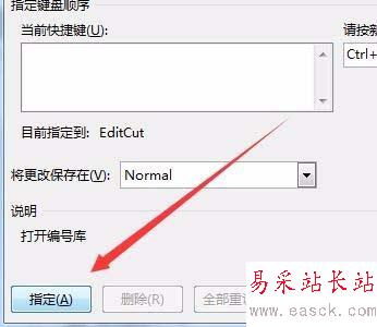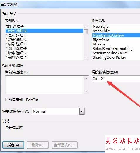 6、接下來在“請按新快捷鍵”下的文本框中輸入快捷鍵,如Ctrl+X,最后點擊“指定”按鈕,再點擊關閉按鈕即可。