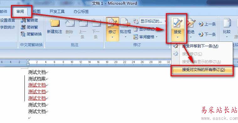 選擇【審閱】-【接受】-【接受對文檔的所有修訂】即可。