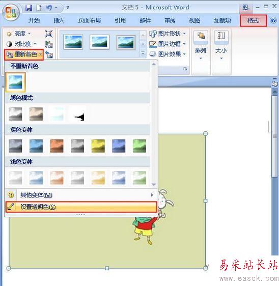2、鼠標單擊該圖片,使其處于選中狀態,單擊“格式”選項卡,選擇“調整”區域中的“重新著色”。在出現的下拉菜單中單擊“設置透明色”;
