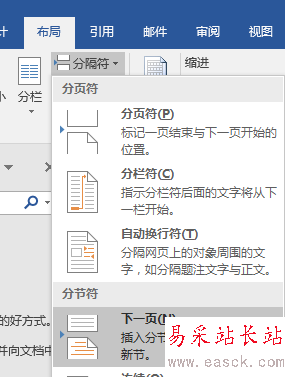 2、選擇【布局】菜單——分隔符——分節符:下一頁,刪除多余頁面