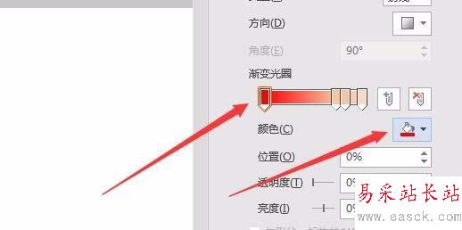 7、接下來就是要設(shè)置“漸變光圈”了,漸變光圈的作用就是設(shè)置漸變的顏色與漸變的位置,選中第一個漸變光圈,然后在下面的“顏色”下拉菜單中設(shè)置好顏色