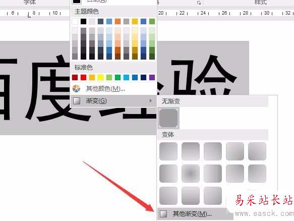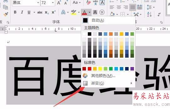 2、接下來點擊開始菜單工具欄上的“字體顏色”下拉按鈕,在彈出菜單中選擇“漸變”菜單項