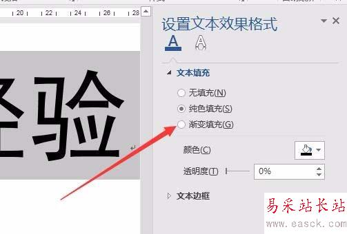 4、在右側(cè)彈出的“設(shè)置文本效果格式”菜單中,選擇“漸變填充”一項