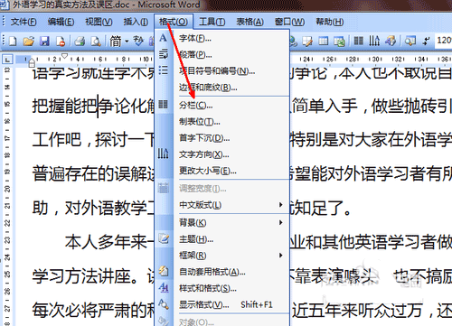3、點(diǎn)擊格式后彈出來的菜單有,有一個分欄的選項,如圖所示,用鼠標(biāo)點(diǎn)擊這個選項。