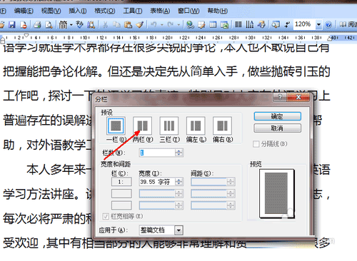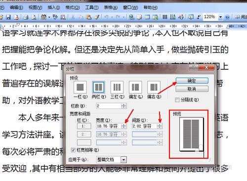 5、然后在右下角的預(yù)覽中就出現(xiàn)了兩欄的示意圖。我們還可以對分欄的寬度進(jìn)行適當(dāng)調(diào)節(jié),以求達(dá)到最佳效果。設(shè)置完成,點(diǎn)擊確定。
