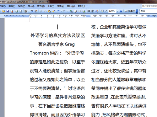 1、如果想將一篇文檔分欄,首先要打開你所要修改的文檔,直接文件打開即可,如圖所示,這篇文檔就是一欄,我們現(xiàn)在就要把這篇文檔的格式分為二欄。