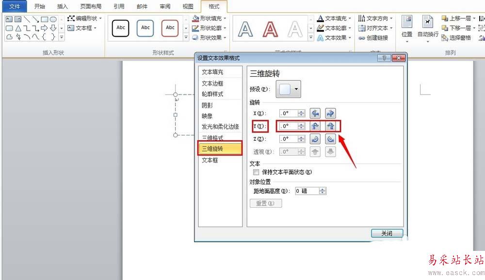 5、在打開的藝術字樣式選項中找到三維旋轉,然后將Y軸的角度改為180度,也就是說文字在Y軸上旋轉180度。