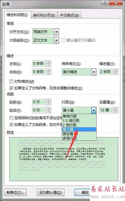 4、然后將段落中的行距和段落間距調(diào)整成最小值。