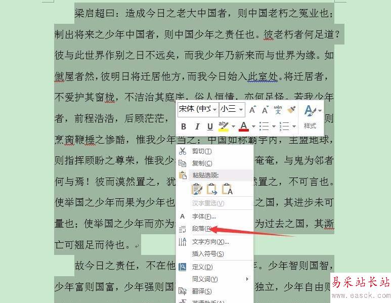 3、設置完畢后,我們在選中的文本中右擊選擇段落。