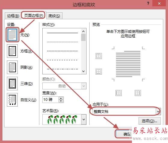 5、取消頁面邊框:在“設計”選項卡,“頁面背景”組中單擊“頁面邊框”按鈕。打開“邊框和底紋”對話框,在“頁面邊框”選項卡,將“設置”選擇“無”,在“應用于”的下拉框中選擇“整編文檔”,然后單擊“確定”按鈕。