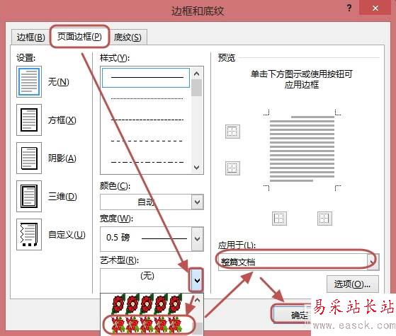 3、打開“邊框和底紋”對話框,在“頁面邊框”選項卡,在“藝術型”的下拉框中選擇一種需要的花邊邊框,在“應用于”的下拉框中選擇“整編文檔”,然后單擊“確定”按鈕。