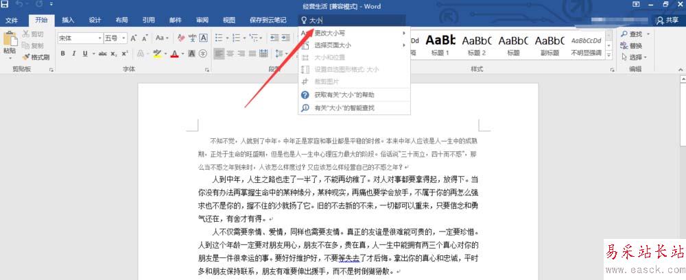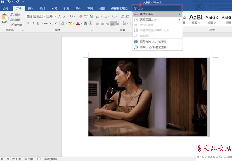 5、在“告訴我你想要做什么”菜單中輸入“大小”。如圖所示。