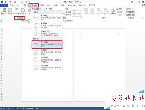 3、將光標(biāo)定位到第一頁(yè),點(diǎn)擊頁(yè)面布局,頁(yè)面設(shè)置,分隔符,下一頁(yè)。點(diǎn)擊過后似乎沒有任何變化。