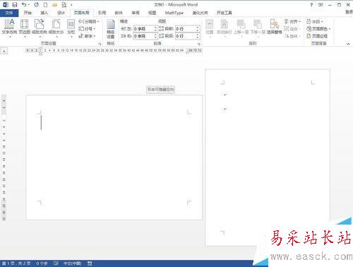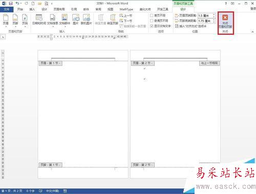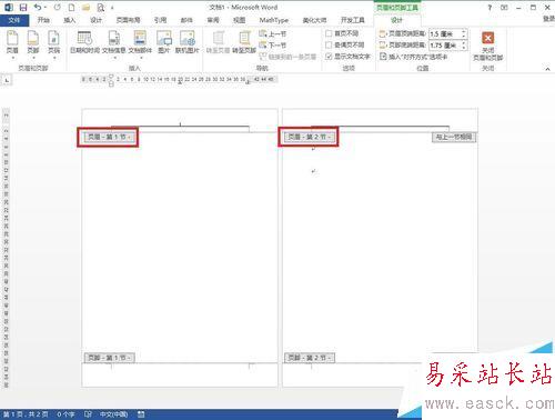 4、在雙擊頁(yè)眉,此時(shí)會(huì)看到頁(yè)眉和頁(yè)腳分為兩節(jié)。