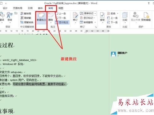7、在word菜單欄“審閱”面板中,點擊“新建批注”,則可以看到批注的簽名已經變成了“加菲貓”,證明,我們的修改已經生效。