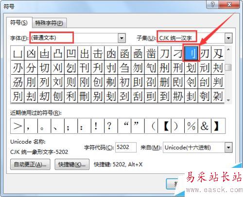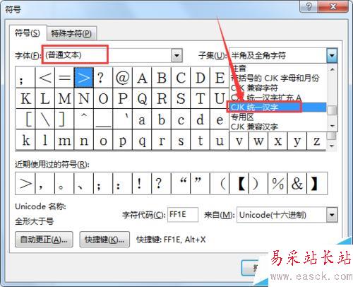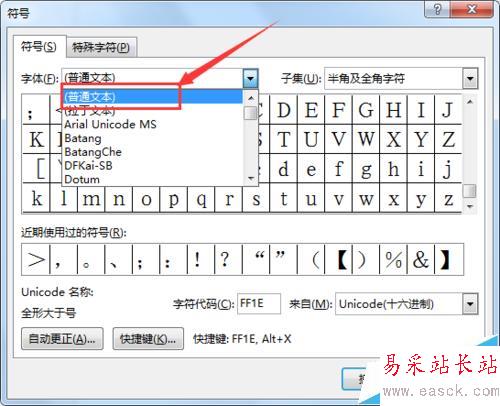 3、打開插入符號窗口后,首先從字體列表中選擇“普通文本”。